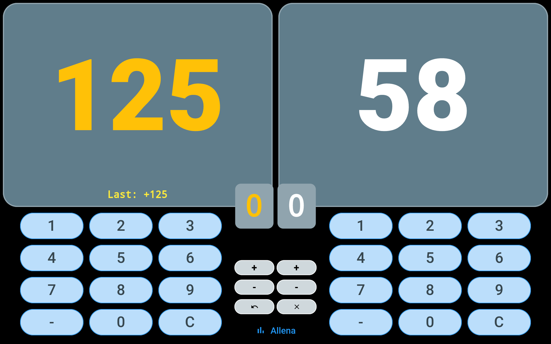 Nella modalità “partita”, l’app funziona come un classico contapunti elettronico con due punteggi, uno per ogni giocatore con caratteri bianchi e gialli.